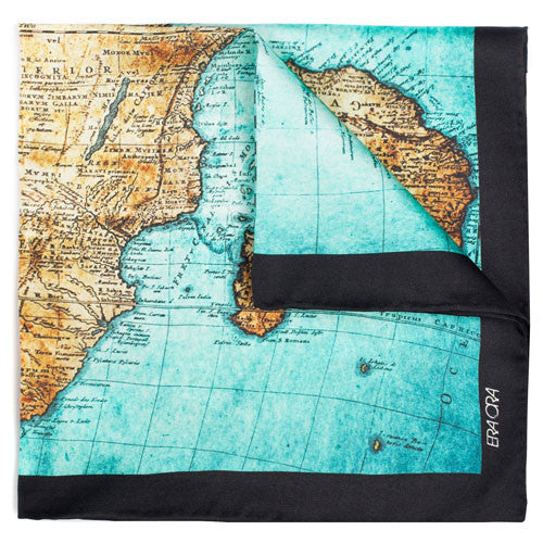 Luxurious mulberry silk pocket square with an ancient map print of Africa. Features hand-rolled hems.